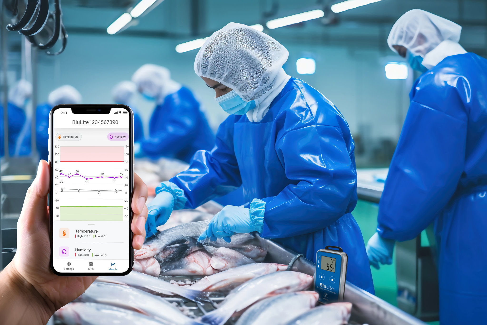 De BluLite maakt het mogelijk om lage en hoge alarmdrempels in te stellen en de loggergegevens op het LCD-scherm te bekijken, dat alarmindicaties in realtime geeft.