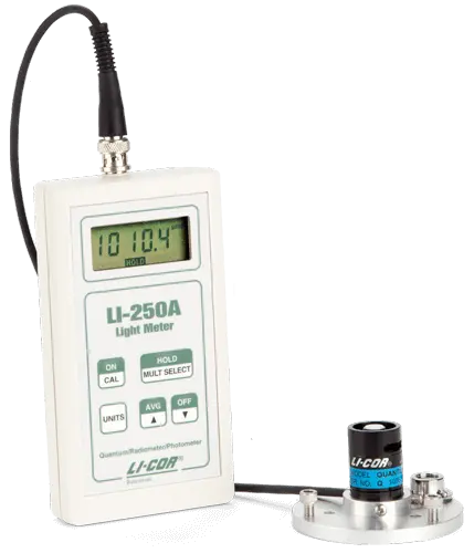 De LI-250A is een draagbare meter die de output weergeeft van elke LI-COR- lichtsensor met een kabel met een BNC-connector. Hij toont momentane waarden of gemiddelden over 15 seconden van de waarden van een sensor.